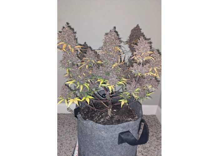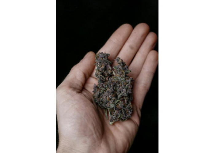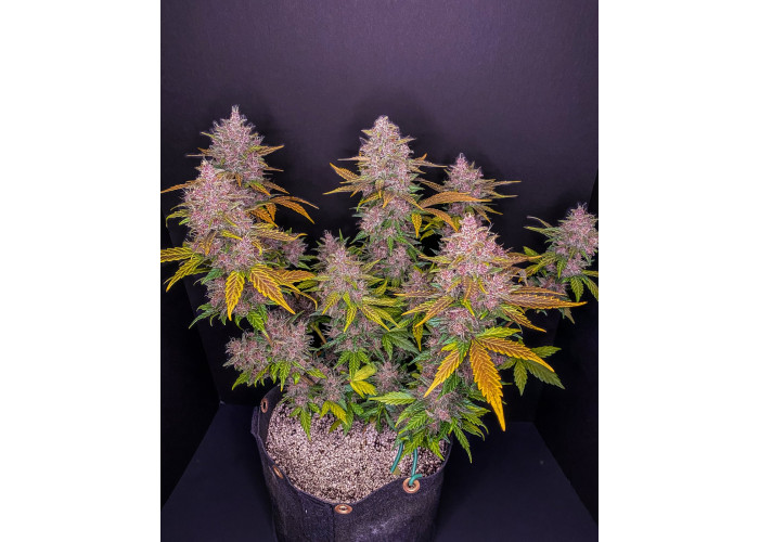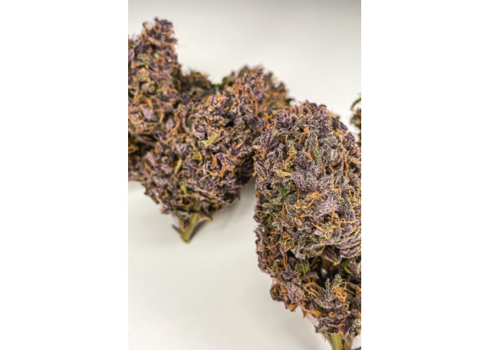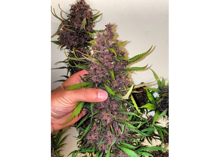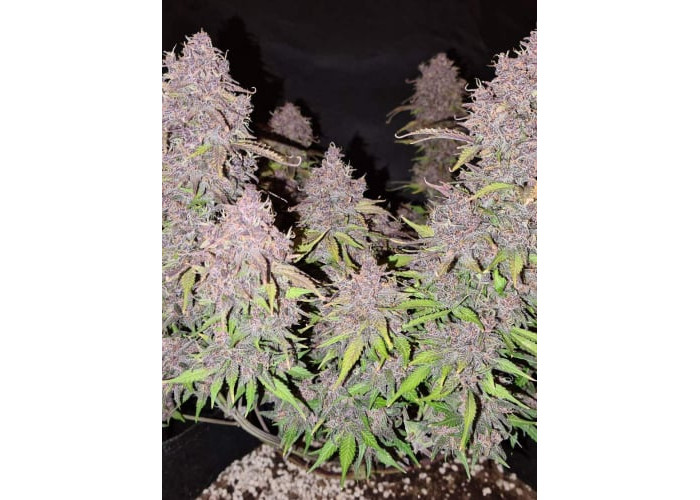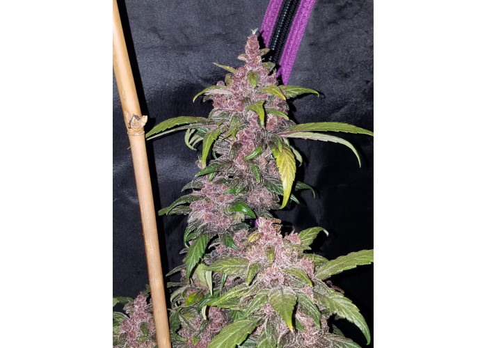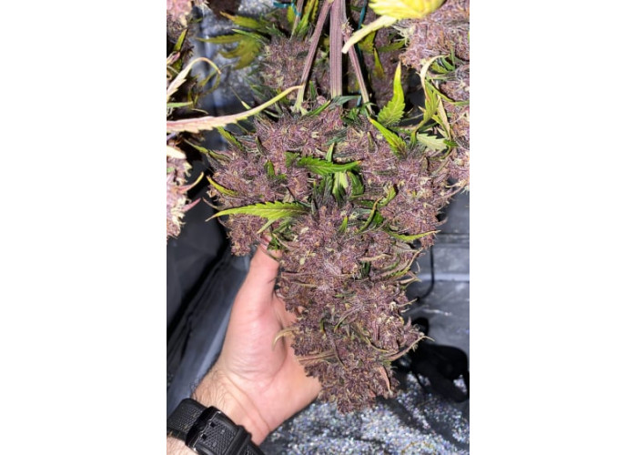• Смола: На фоне темных чашечек белоснежные трихомы создают невероятный контраст, делая этот сорт идеальным для производства фиолетового гашиша и экстрактов.